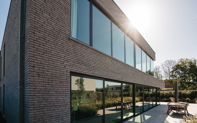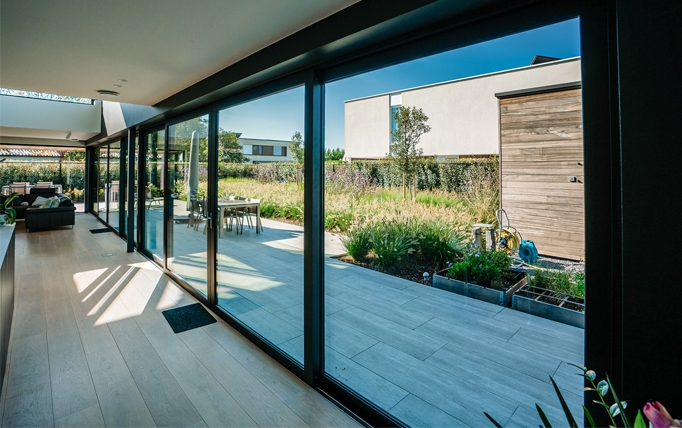 Villa with large lifting sash windows equipped with rubber seals, giving them a higher air and water tightness than ordinary sash windows. They can handle a weight of up to 440 kg. Here, duo-rail sliding windows of 4 parts were chosen with the middle 2 sliding outwards. This gives a large opening and a great indoor-outdoor feeling. These Ultraglide sliding windows also exist in a Max Light version, where the profile of the transom is less wide. Colour of the aluminium profiles in this project: 905PT