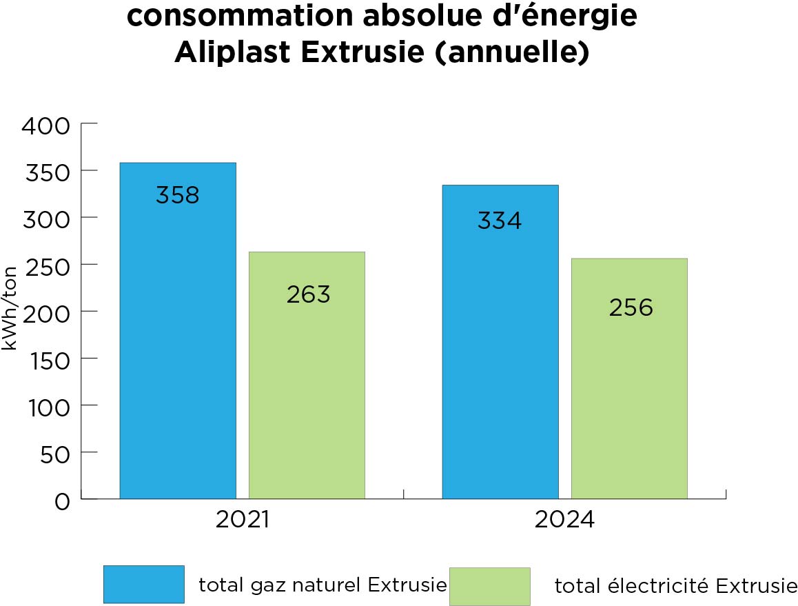 - Augmenter l'achat annuel d'électricité renouvelable pour l'ensemble du groupe, de 63 % en 2022 à 100 % en 2030. Aliplast atteint elle-même déjà 100 %.