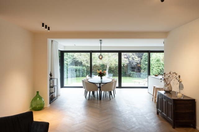 Pour cette belle villa, notre partenaire EVC a choisi une fenêtre coulissante duorail Ultraglide. Les profils du cadre et de l'ouvrant ont la même hauteur. Le seuil plat assure une belle transition entre l'intérieur et le jardin. Remarquez la porte d'entrée pivotante XL : cette porte de la gamme Star90 à ouvrant caché dispose d’une entaille verticale étroite qui sert de poignée. Pour les fenêtres fixes et oscillo-battantes, EVC a installé le Max Light moderne. Toutes les menuiseries ont la couleur 9017LC. Architecte : Velor Architects Brasschaat --- Entrepreneur : Construmax --- Photographie : Nicolas da Silva Lucas